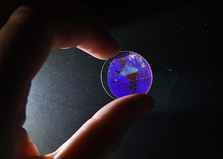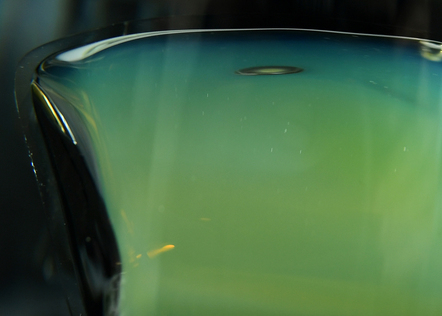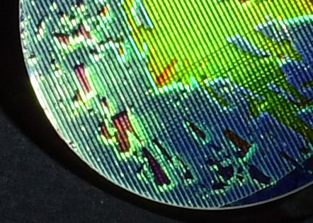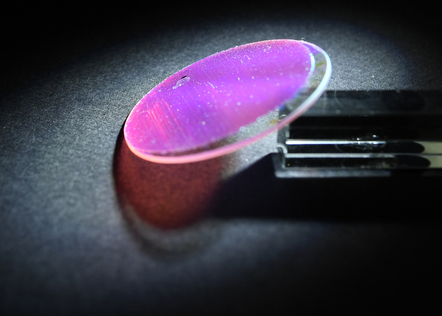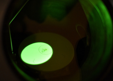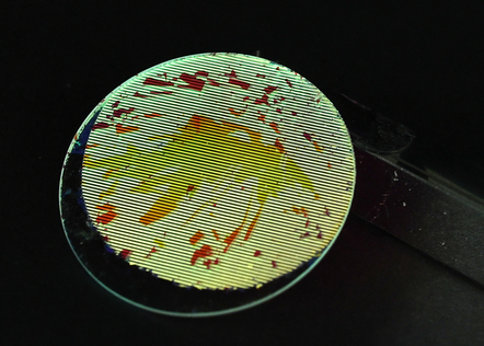 A Thousand Shades of Green, an Attempt, is a nano engraving test using electronic lithography employing millions of gold cylinders, whose diameters increase from 50 to 100 nanometers, on a 2-square-centimeter glass disk. During the process, some parts of the metal layer deposited through the lithographic mask—too large for current technologies (limited to 1 square millimeter)—are torn away when the mask is peeled off. The damaged areas then reveal a world of iridescence, in green, orange, and blue.