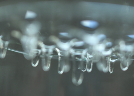 The two installations, Alchimie de la lumière – nanosculptures, resemble cabinets of curiosity cabinet; they were created for the exhibition OU\/ERT in Bourges (2019) and Bourges contemporain in 2021. The glass forms, isolated or creating a landscape, change color according to the transformations of the light scene. The blown forms contain metallic nanoparticles, produced by chemical assembly, which emit a thousand new shades of green, depending on the angle that we look at it from. The aqueous nanoparticle solution thus appears green when seen in direct light and orange or blue in transparency.