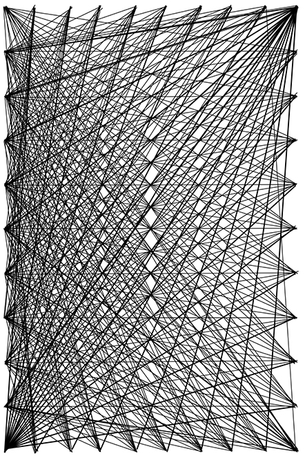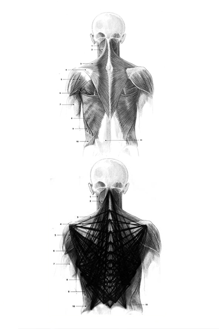 Jeanne Vicerial, Patrón del tejido muscular dorsal reproducido en hilo mediante tricotissage y fijado a la imagen superior. © Adagp, París, 2022. © Ullmann Medien GmbH, Rolandsecker Weg 30, 53619 Rheinbreitbach, Alemania.